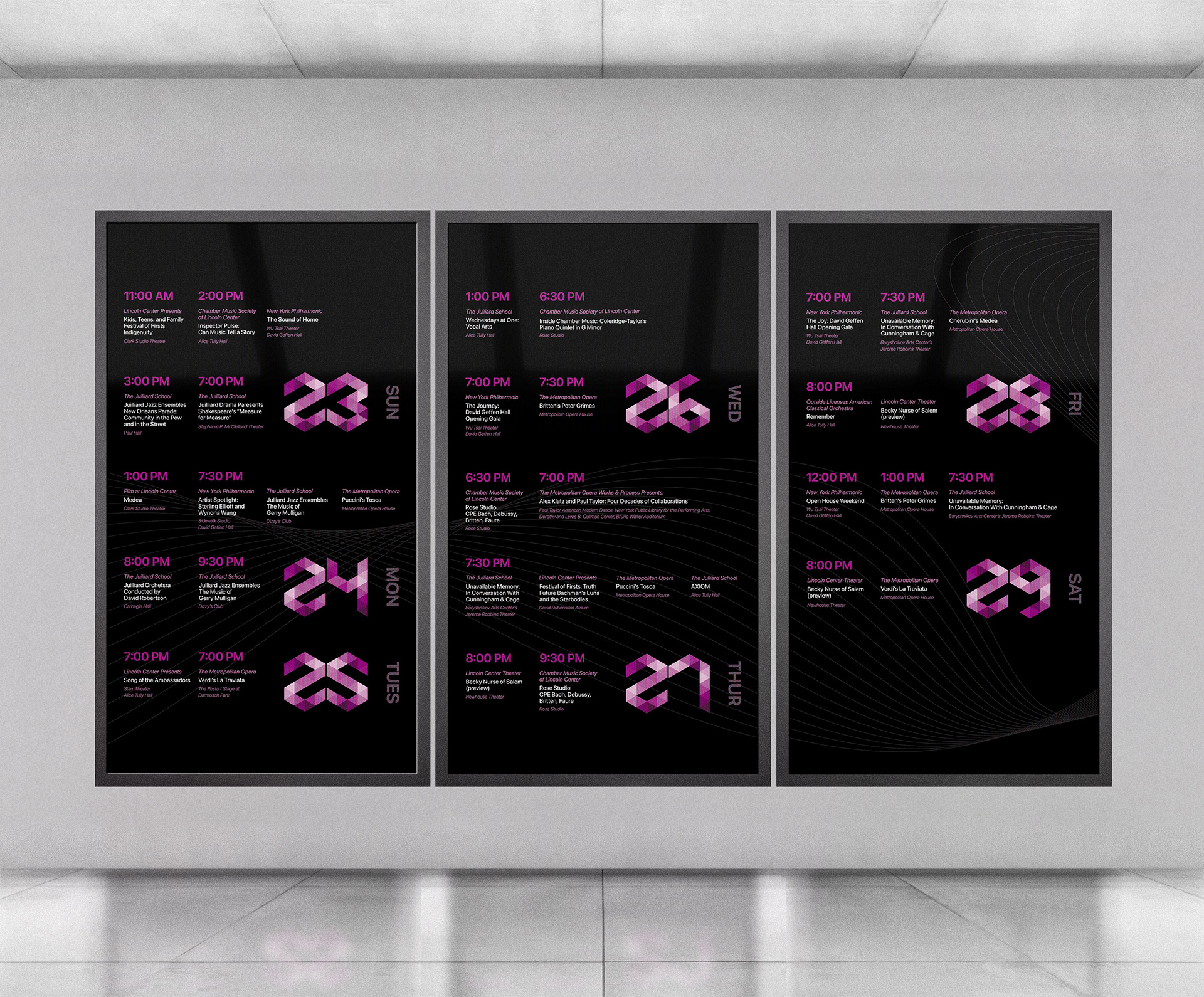 Goal: Create a design for a multi-panel sequence to convey a week of scheduled performances at Lincoln Center.
