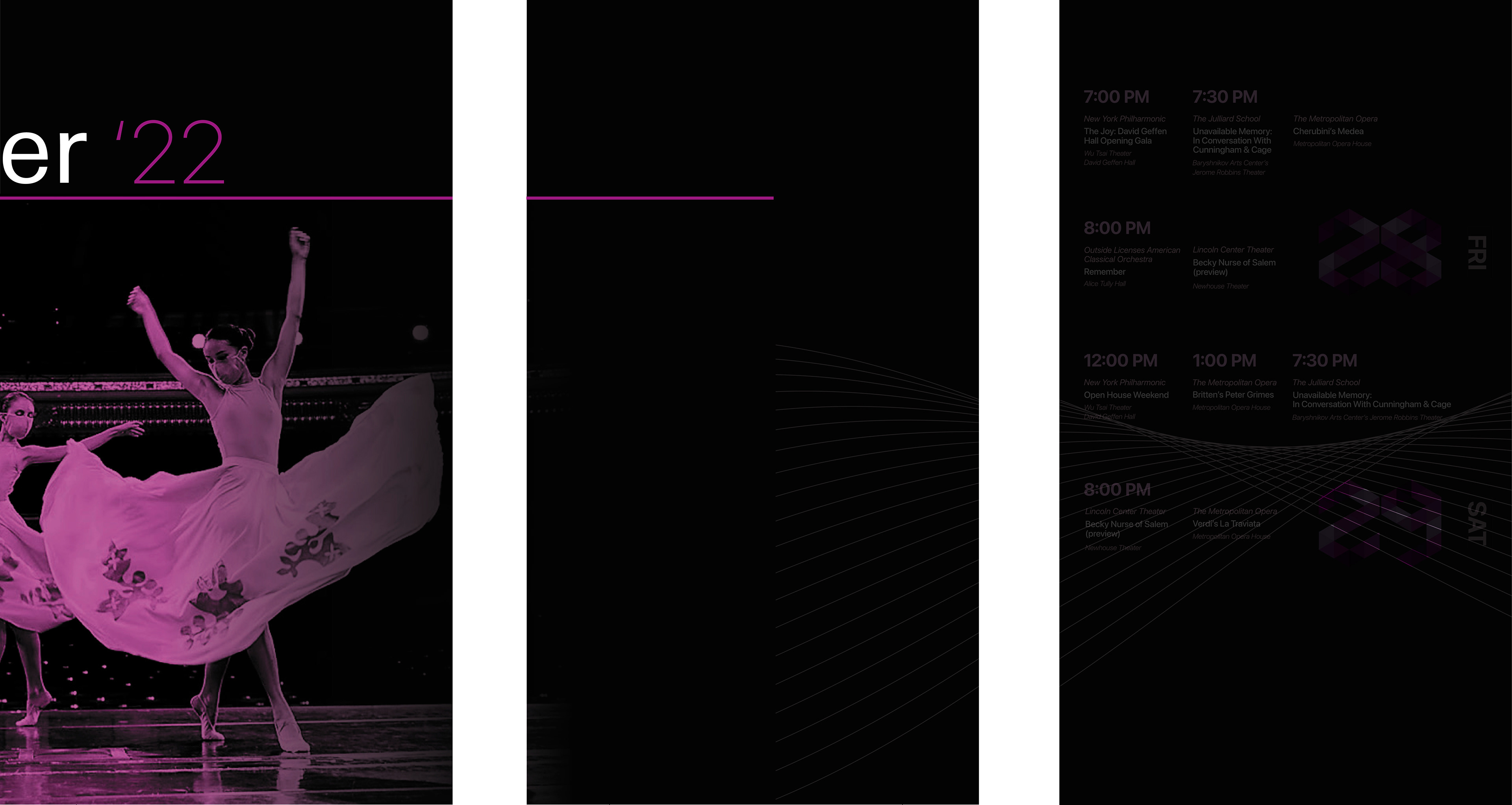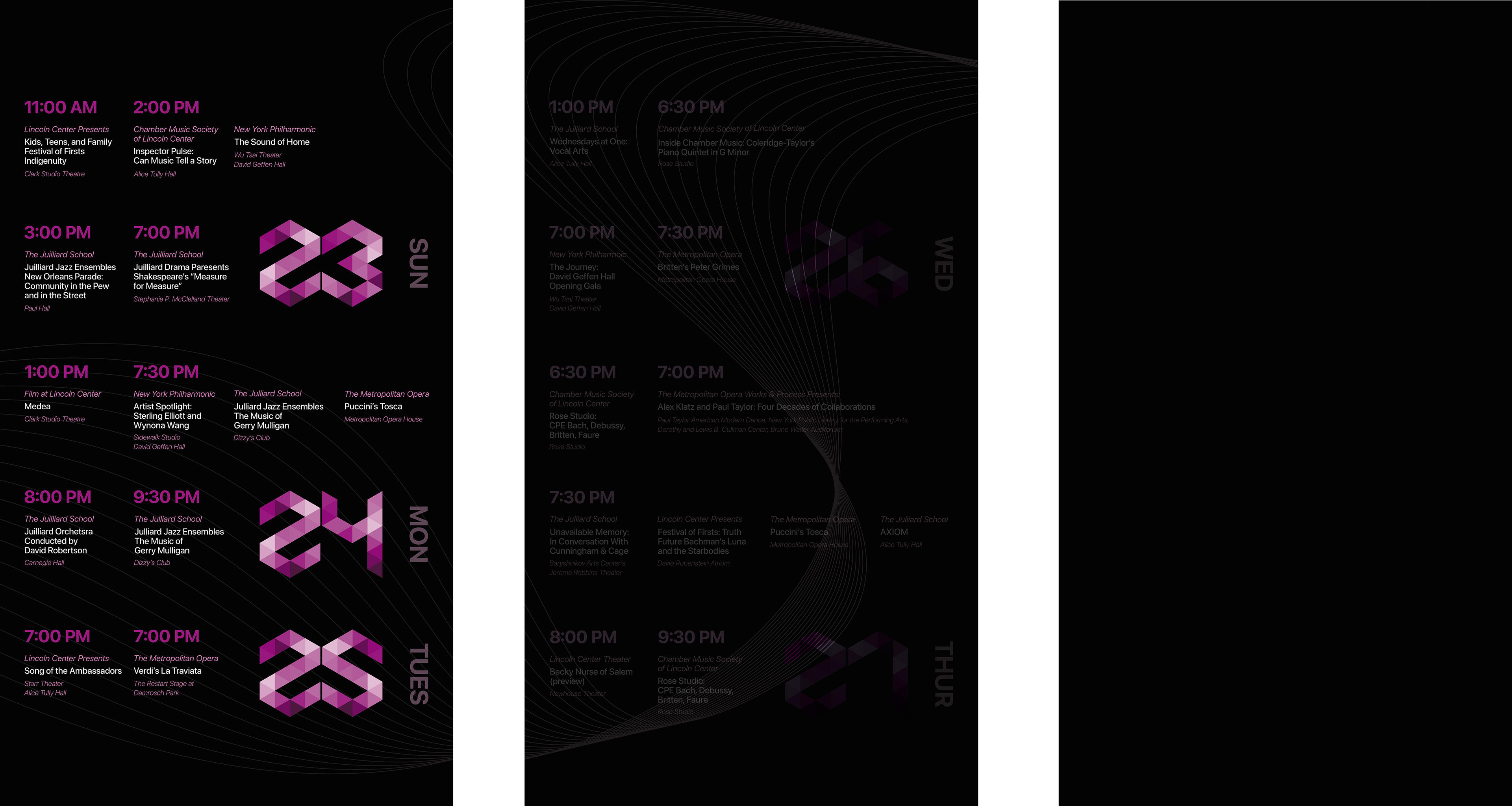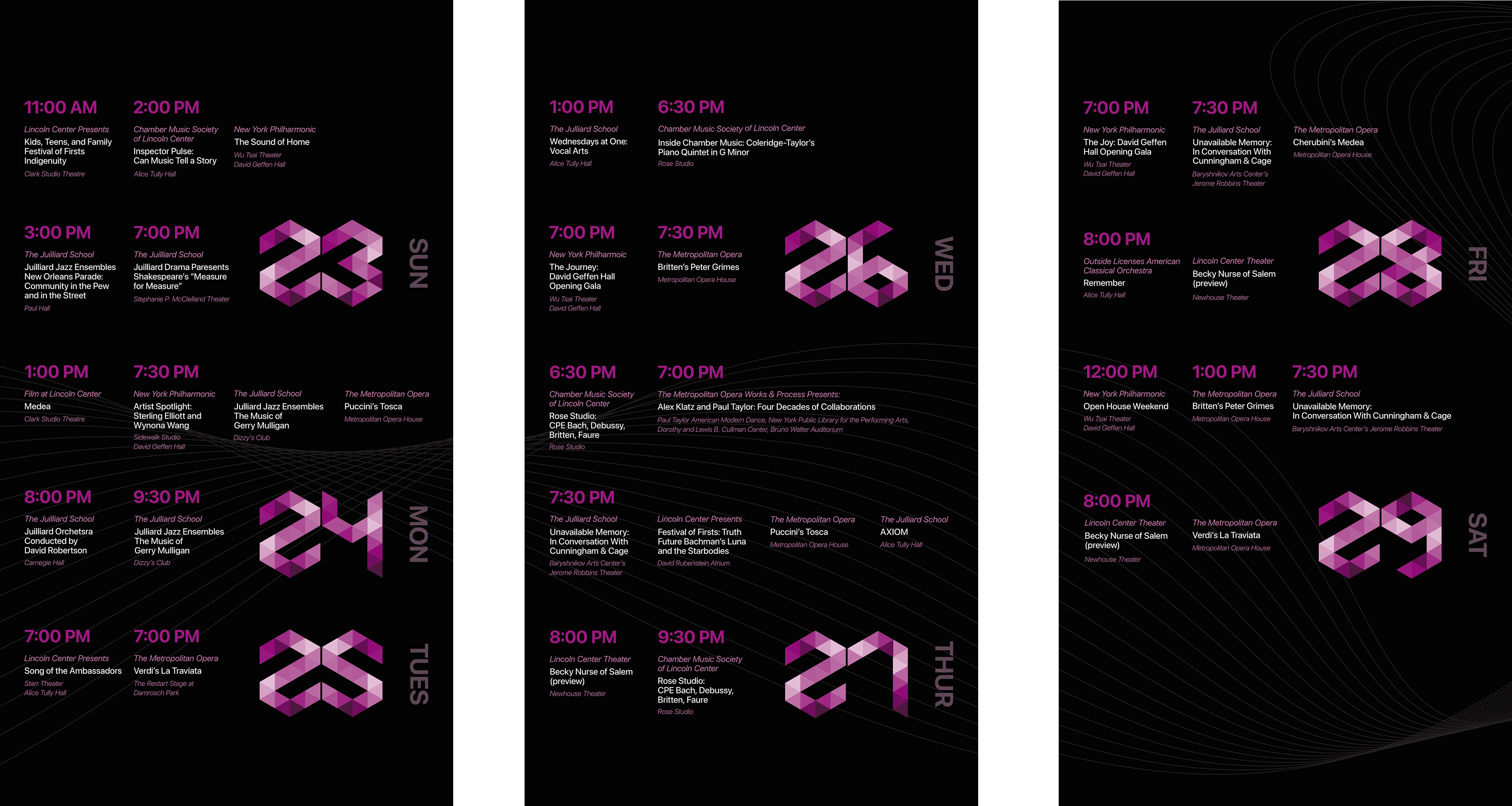 Goal: Create a design for a multi-panel sequence to convey a week of scheduled performances at Lincoln Center